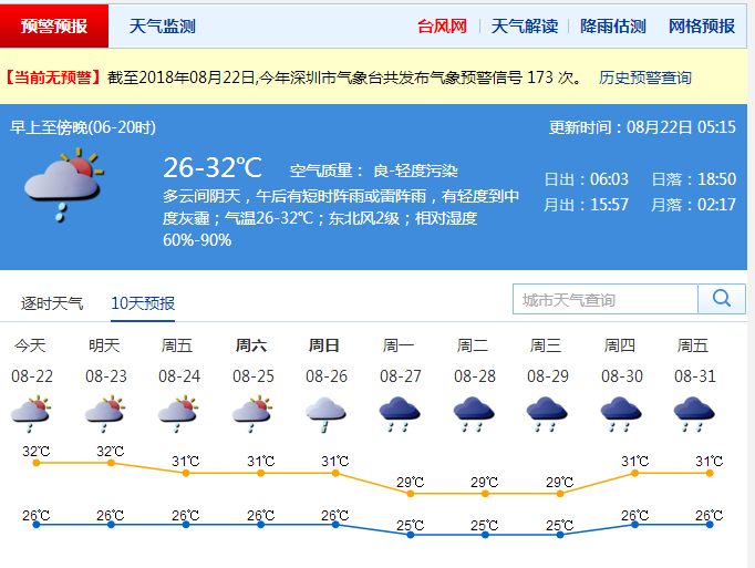 深圳新聞網(wǎng)訊 灰霾、陣雨齊上陣。多云仍是今日天氣的主格調(diào),午后還會出現(xiàn)短時陣雨或雷雨。部分時間仍有輕度到中度灰霾,能見度下降至10公里以內(nèi)。氣溫依舊較高,最低氣溫在26℃左右,最高氣溫升至32℃左右,市民應注意防暑降溫。