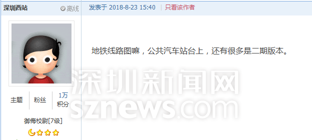 就此,網(wǎng)友“香滿樓”吐槽相關(guān)部門只管建設(shè),不管維護(hù)保養(yǎng)。網(wǎng)友“深圳西站”同時反映,深圳公共汽車站臺上,還有很多地鐵路線圖是二期版本。