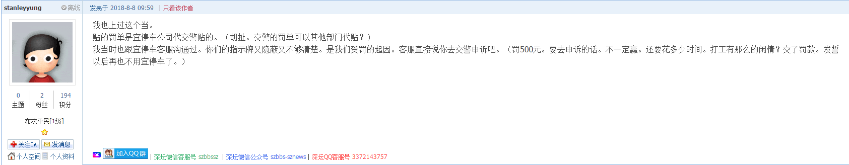 深圳新聞網(wǎng)8月29日訊(記者 施冰冰)“深圳的國資泊車位,對(duì)外地人來說是個(gè)坑?!本W(wǎng)友wzmaodong在論壇上發(fā)帖吐槽深圳宜停車。該帖文主要描述了作者因?qū)ι钲诓窜囈?guī)則了解不清,繼而被交警貼罰單的全過程,這讓出差在外的他感到“很冤”。同時(shí)也有幾位網(wǎng)友跟帖表示自己也交過這500元的“學(xué)費(fèi)”。(《深圳的國資泊車位,對(duì)外地人來說就是個(gè)坑。在不知道深圳泊車規(guī)則的情況下,輕易的被交警貼罰單。》)
