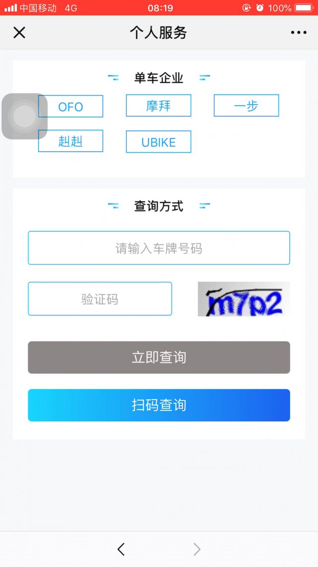 提交完手機(jī)號和驗(yàn)證碼之后,我們就來到了這個(gè)頁面,在這里,你可以選擇你要查詢的共享單車的品牌,品牌選擇完畢后,你可以選擇手動(dòng)輸入車牌號碼或掃碼查詢!