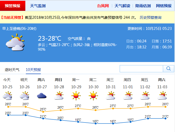 本周中后期,深圳早晚清涼,中午炎熱,最高氣溫維持在28-29度,最低氣溫22-23度,溫差增大,市民應(yīng)注意預(yù)防感冒。本周末,受南下的冷空氣影響,深圳最高氣溫回落至26度左右,天氣較為舒適。