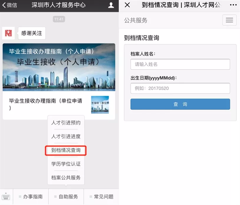 關(guān)注“深圳市人才服務(wù)中心”公眾號查詢到檔情況,辦理檔案相關(guān)業(yè)務(wù)。