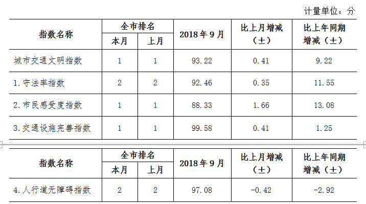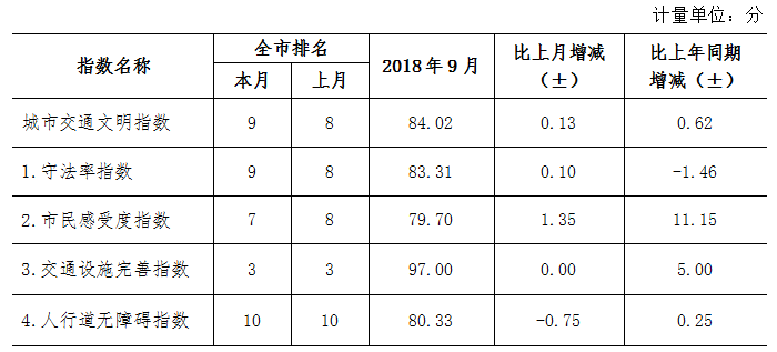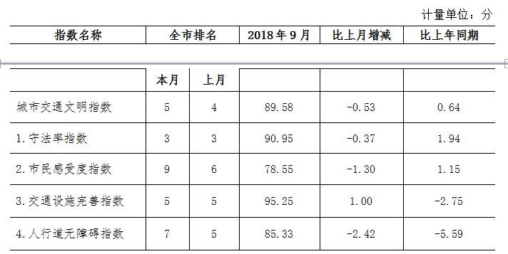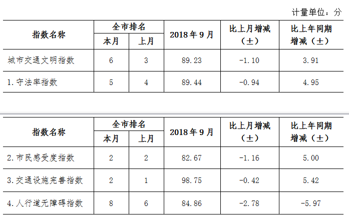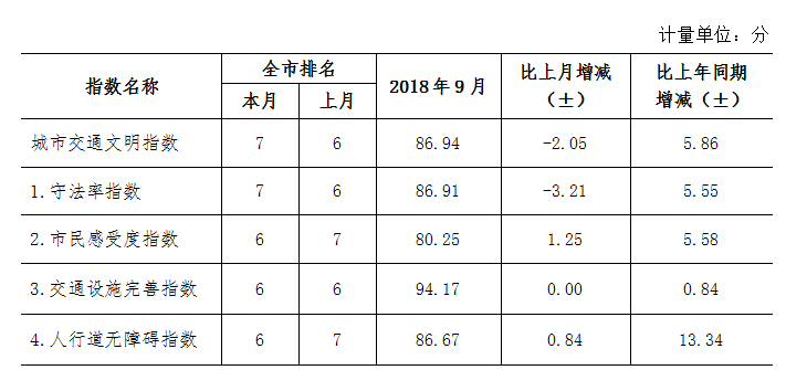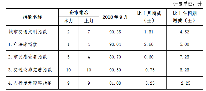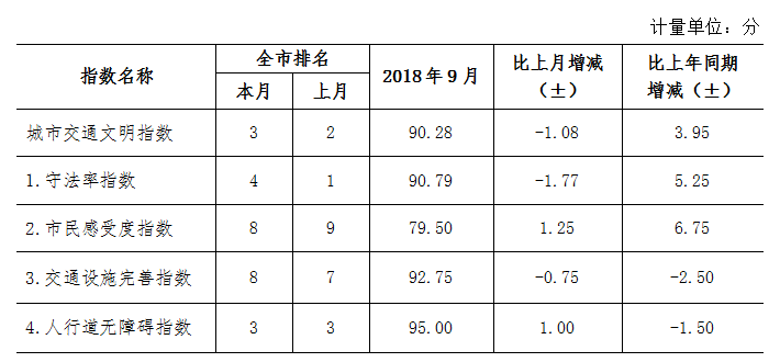 9月份深圳市城市交通文明指數(shù)為87.02分。與上月對比,四項分項指數(shù)呈“三升一降”現(xiàn)象。