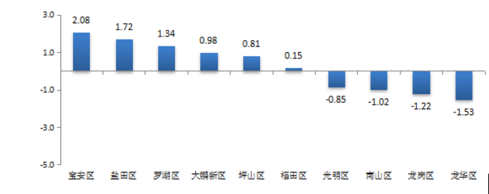 從各區(qū)(新區(qū))城市交通文明進(jìn)步指數(shù)來看,福田區(qū)、羅湖區(qū)、鹽田區(qū)、寶安區(qū)、坪山區(qū)和大鵬新區(qū)均有所進(jìn)步,其中寶安區(qū)進(jìn)步最大,進(jìn)步指數(shù)為2.08%,鹽田區(qū)次之,進(jìn)步指數(shù)為1.72%;而南山區(qū)、龍崗區(qū)、光明區(qū)和龍華區(qū)則有所退步,其中龍華區(qū)和龍崗區(qū)退步較大,進(jìn)步指數(shù)分別為-1.53%和-1.22%(見圖4)。