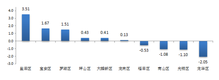 與上月對比,各區(qū)(新區(qū))城市交通文明指數(shù)呈現(xiàn)“六升四降”局面。羅湖區(qū)、鹽田區(qū)、寶安區(qū)、龍崗區(qū)、坪山區(qū)和大鵬新區(qū)得分有所上升,其中鹽田區(qū)上升幅度較大,增加3.51分;福田區(qū)、南山區(qū)、光明區(qū)和龍華區(qū)得分均有不同程度下降,其中龍華區(qū)下降幅度最大,減少2.05分,其次是光明區(qū)和南山區(qū),分別減少1.10分和1.08分(見圖3)。