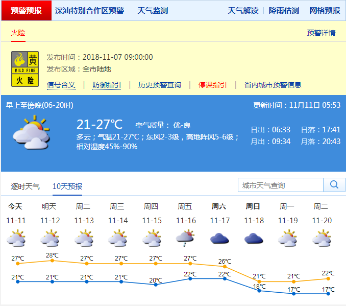 預(yù)計(jì)早晨7-9時(shí),全市多云間陰天;氣溫21 ℃ -23 ℃,相對(duì)濕度75%-90%,輕微偏東風(fēng),能見(jiàn)度3-15公里。深圳市氣象臺(tái)2018年11月11日06:01發(fā)布。