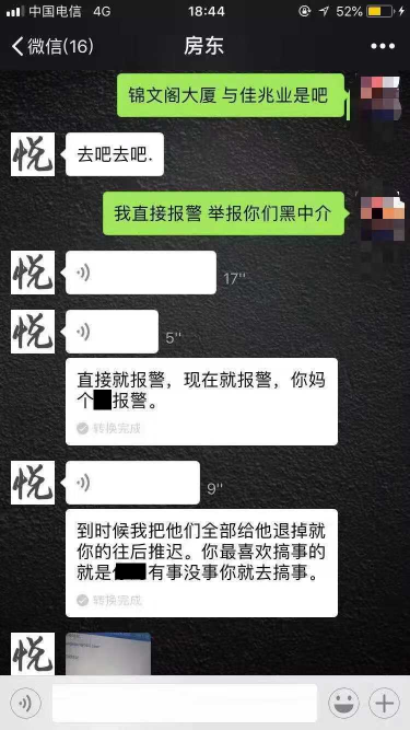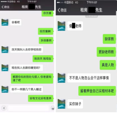追索押金的過程并不平靜。10月13號的一次微信溝通中,余某亮對李小姐以文字和色情圖片進(jìn)行人身恐嚇、辱罵和性騷擾。記者還獲悉,余某亮至少對2人女租客進(jìn)行過性騷擾,也有男租客稱受到余某亮等人的人身恐嚇。