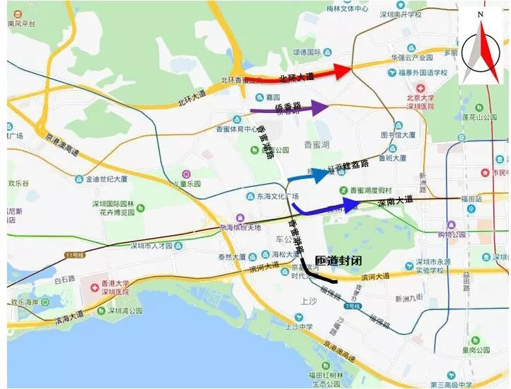 片區(qū)繞行:原經(jīng)香蜜湖路輔道往濱河大道東行的車(chē)輛,可沿香蜜湖路繼續(xù)前行至十七號(hào)街和沙嘴路左轉(zhuǎn)進(jìn)入濱河大道。