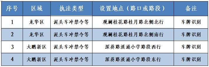4套車(chē)牌識(shí)別監(jiān)控設(shè)備可用于查處泥頭車(chē)違反禁行限行規(guī)定等交通違法行為。位于龍華區(qū)的觀瀾桂花路桂月路和大鵬新區(qū)的深葵溪涌小學(xué)路段。