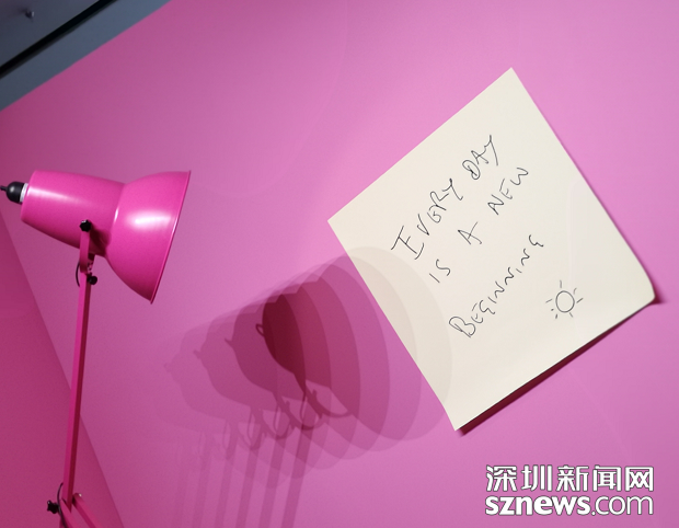 Anglepoise是英國(guó)經(jīng)典的臺(tái)燈設(shè)計(jì),Paul Smith先生以他的英式幽默,將它依比例放大成巨型臺(tái)燈,并涂上了展覽主色系的粉紅色,背景再加上 Paul Smith先生最喜愛的便利貼 EVERY DAY IS A NEW BEGINNING,在展覽出口作為對(duì)每位觀眾最后的謝禮。