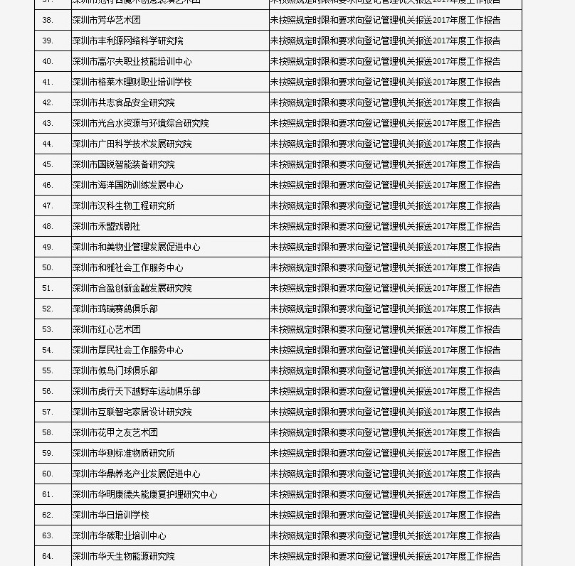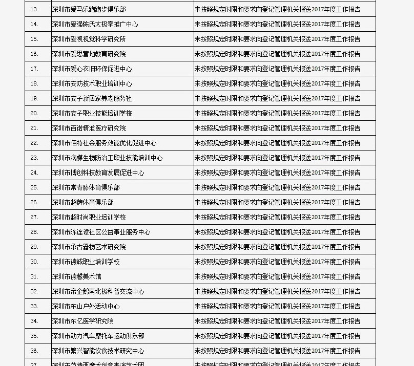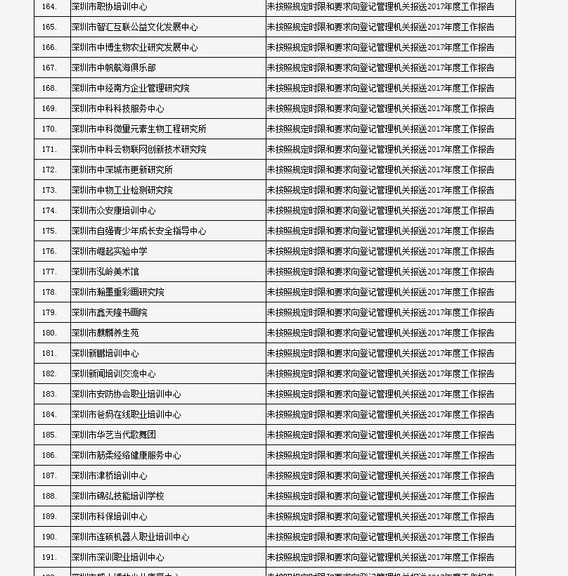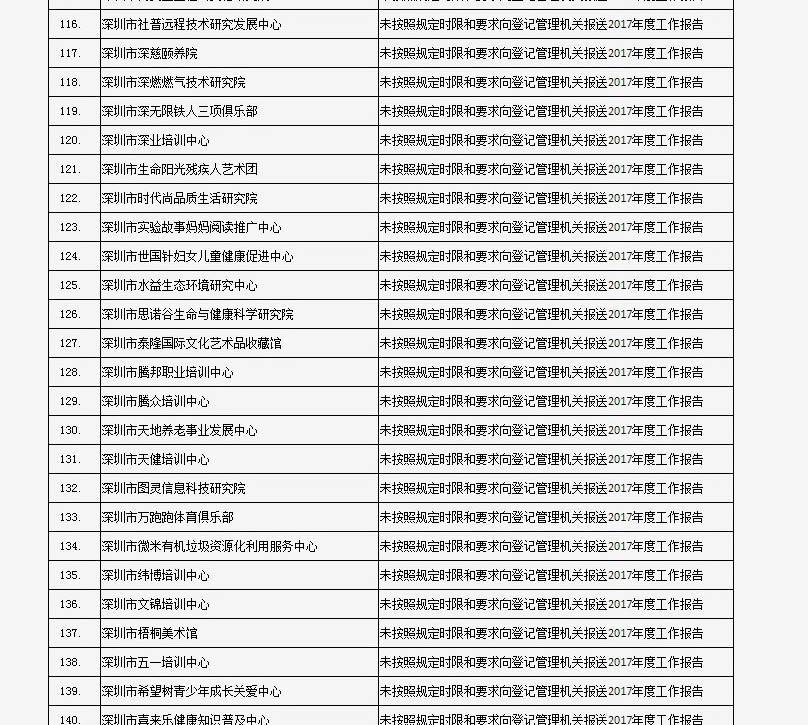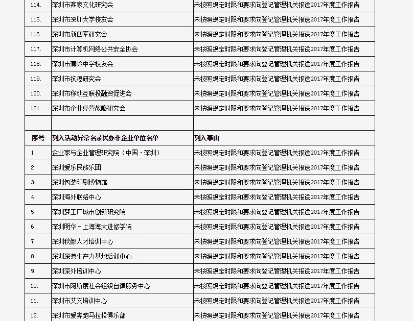 據(jù)深圳市民政局通報,深圳市華中科技大學校友會和深圳市深圳大學校友會等121家社會團體、深圳市郴州商會等75家行業(yè)協(xié)會商會、企業(yè)家與企業(yè)管理研究院(中國·深圳)等201家民辦非企業(yè)單位、深圳市明園慈善基金會等20家基金會,經(jīng)查“未按照規(guī)定時限和要求向登記管理機關(guān)報送2017年度工作報告”,違反了《社會組織信用信息管理辦法》《深圳經(jīng)濟特區(qū)行業(yè)協(xié)會條例》的相關(guān)規(guī)定,被列入活動異常名錄名單。完整版名單已在“深圳民政在線”公布。