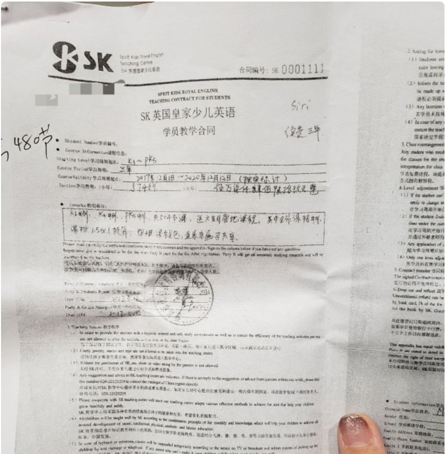 ▲家長(zhǎng)提供合同顯示課時(shí)和款項(xiàng)