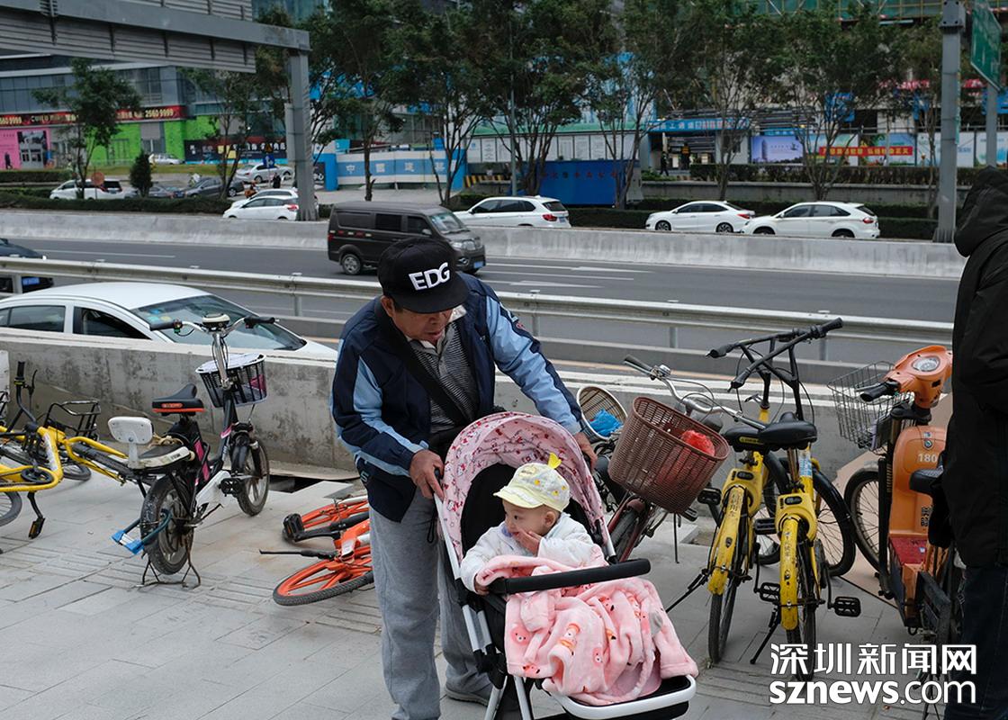 2018年12月12日,福田新洲,氣溫降至13度,寶寶穿上了羽絨服外出。