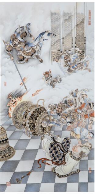 顧堅(jiān)瓷板畫(huà)代表作再現(xiàn)了齊天大圣大鬧天宮的經(jīng)典畫(huà)面(展覽方 供圖)