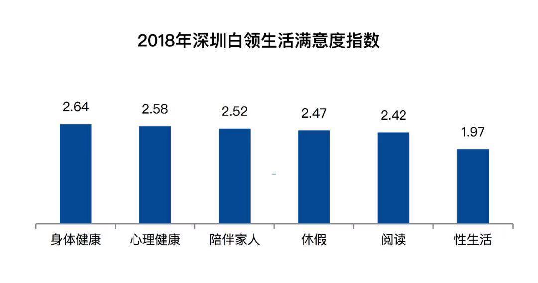 另外,根據(jù)調(diào)查,深圳白領(lǐng)對(duì)自己身體健康狀況的滿意度最高,對(duì)自己的性生活最不滿意。性生活雖然是一個(gè)隱秘的話題,但是卻又是決定白領(lǐng)生活質(zhì)量很重要的一環(huán),工作壓力大、經(jīng)濟(jì)壓力大也是深圳白領(lǐng)無(wú)暇戀愛(ài),不能有太多精力經(jīng)營(yíng)兩性關(guān)系的重要原因,如何在中間找到平衡點(diǎn),需要企業(yè)和雇員一起思考。