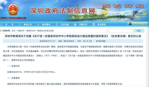 深圳新聞網(wǎng)12月24日訊(記者 余俐潔)為緩解深圳中小學(xué)學(xué)位日益緊缺的矛盾,近日,深圳市教育局官網(wǎng)發(fā)布《關(guān)于進(jìn)一步提高深圳市中小學(xué)校規(guī)劃設(shè)計(jì)建設(shè)質(zhì)量的指導(dǎo)意見(jiàn)(征求意見(jiàn)稿)》(以下簡(jiǎn)稱“指導(dǎo)意見(jiàn)”),進(jìn)一步加強(qiáng)義務(wù)教育學(xué)校建設(shè),合理規(guī)劃、科學(xué)統(tǒng)籌,積極擴(kuò)大中小學(xué)學(xué)位供給。