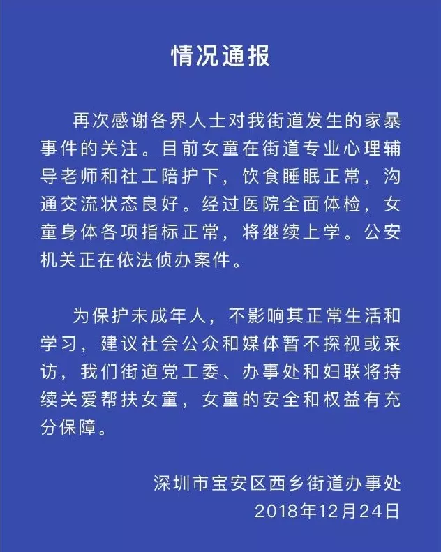 12月24日晚上,深圳市寶安區(qū)委宣傳部官方微博@陽(yáng)光寶安再次發(fā)布通告,稱女童目前飲食睡眠正常,將繼續(xù)上學(xué)。公安機(jī)關(guān)正在依法偵辦案件。