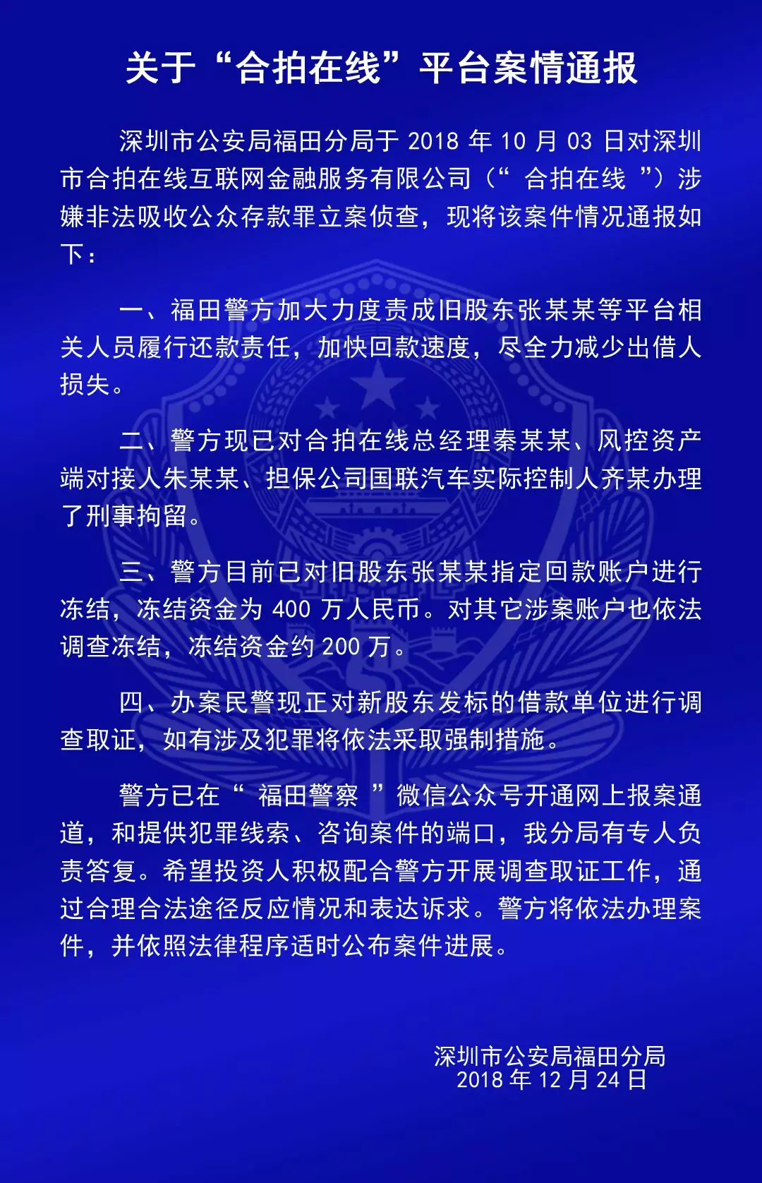 關(guān)于“合拍在線”“壹佰金融”“五星財富”“眾車在線”“財富中國”“小零錢”“錢爸爸”“合時代”和“前金融”平臺的案情通報