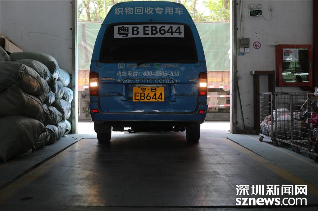 在福田區(qū)梅林一村的近停車場入口處,記者在幾乎要滿的織物回收箱前等待著該公司運輸車輛的到來。不久后,一輛噴涂有織物回收專用車字樣的面包車進入了停車場。據(jù)介紹,該車輛噴涂為政府統(tǒng)一要求,進行廢舊織物回收的作業(yè)的車輛需要有統(tǒng)一的涂裝。
