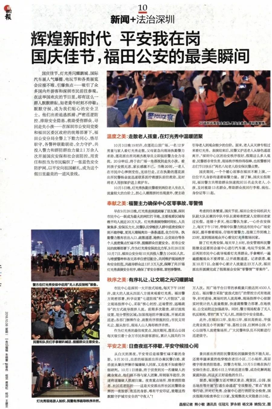 ★★深圳燈光秀表演持續(xù)時(shí)間長,每晚平均人流近20萬人次,安保工作強(qiáng)度大。福田分局參與安保工作的警力堅(jiān)守崗位,維護(hù)現(xiàn)場秩序,在各個(gè)出入口、疏散通道、地鐵口、公交站臺(tái)等人流密集點(diǎn)都能看到他們忙碌的身影。