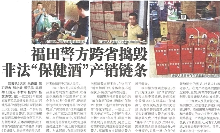 ★★福田警方聯(lián)合深圳市場稽查局藥品稽查處,在阿里巴巴“打假特戰(zhàn)隊”協(xié)助下,經(jīng)過一個多月偵查,于粵湘兩地?fù)v毀了非法“保健酒”的產(chǎn)銷鏈條,刑拘9名嫌疑人,涉案價值近千萬元人民幣。