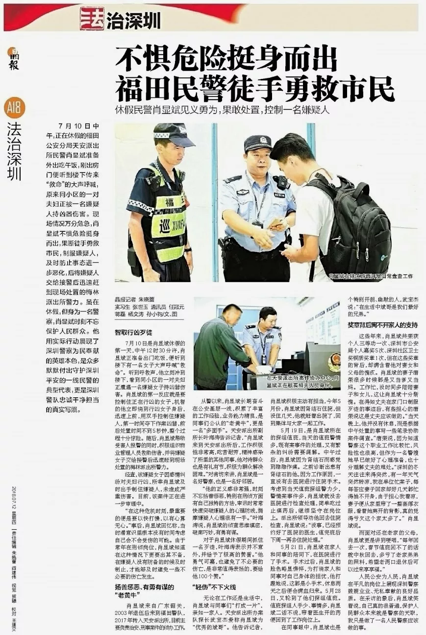 ★★天安派出所民警肖顯斌休假第一天,面對突發(fā)持刀行兇險情,挺身而出,果斷處置,化險為夷。英雄的壯舉并非偶然,源自平時工作的盡忠職守,源自人民警察的責任與使命。