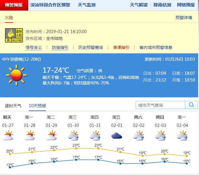 深圳新聞網(wǎng)2019年1月26日訊 今日氣溫17-24℃,晴天干燥,相對濕度40%-70%。深圳市氣象局預計2019-01-27:晴天間多云,天氣干燥氣溫:12-20;2019-01-28:晴天間多云氣溫:15-21;2019-01-29:晴天間多云氣溫:16-21;2019-01-30:多云氣溫:17-22;2019-01-31:多云氣溫:17-23;2019-02-01:陰天間多云,有零星小雨氣溫:15-21;2019-02-02:多云氣溫:15-19;2019-02-03:多云氣溫:16-20;2019-02-04:陰天間多云,有分散小雨氣溫:15-19