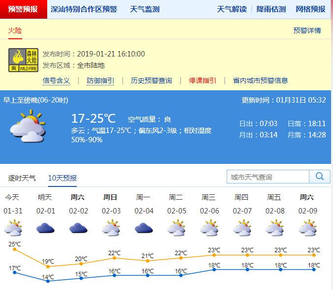 深圳新聞網(wǎng)2019年1月31日訊 深圳氣象局預(yù)計31日陰天間多云,偶有零星小雨,有輕霧或輕微霾,氣溫16-25℃;1-5日陰天間多云,部分時間可見陽光,間中有零星小雨,氣溫小幅波動,其中1日受冷空氣影響,沿海和高地偏北風(fēng)最大陣風(fēng)7級,最低氣溫略降3℃左右,3-4日暖濕氣流加強(qiáng),早晚有輕霧或霧。