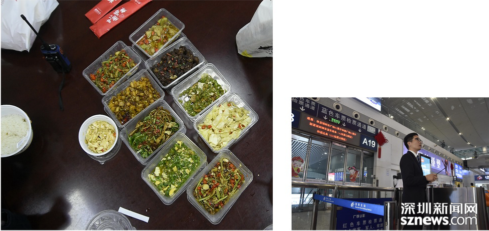 春運(yùn)第一天,人流如織。從下午2點(diǎn)半上班開始,聶新強(qiáng)忙了5個(gè)鐘頭,安全送走大約20萬(wàn)人。晚上七點(diǎn)半,在各閘機(jī)口頂替了五位同事吃晚飯之后,聶新強(qiáng)終于吃上了“豪華”外賣“快餐”,“豪”的是一人獨(dú)享八人份,“快”的是只用了10分鐘不到就結(jié)束了戰(zhàn)斗。