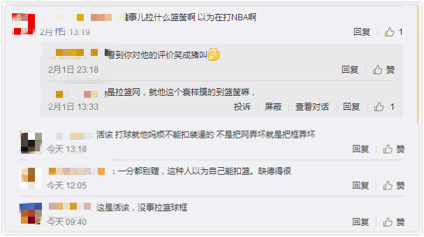 還有一些網(wǎng)友借機表達了自己對某類人的"墻裂"不滿?。]事兒拉什么球框啊,以為在打 NBA啊""活該,打球就煩不能扣還裝 X的"......