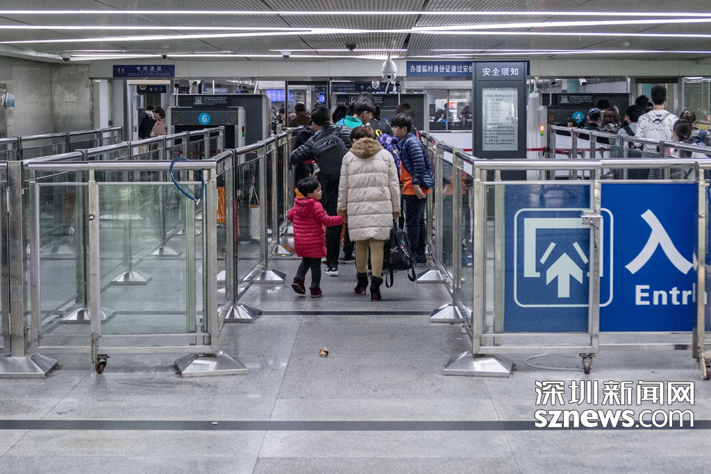 2月2日18:10深圳站廣深列車進(jìn)站處,旅客安檢進(jìn)站(實習(xí)生 關(guān)天宇攝)