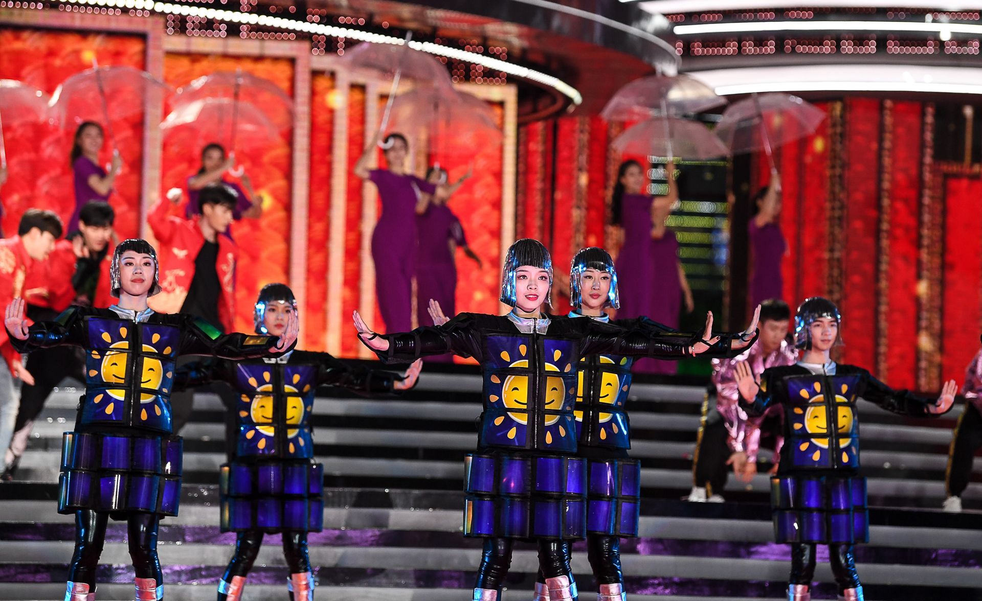 據(jù)本次晚會的視覺總監(jiān)李風介紹,這次用屏量達到了5885個平方,是有史以來最多的?!岸页肆看笠酝?它整個的結構特別復雜,因為它有200多個立體幾何面。整個城市樓宇我們定義成一幅長卷,同時它有個支點,就是平安大廈這個高度,想用平安支點的這個立面來呈現(xiàn)節(jié)目單。”