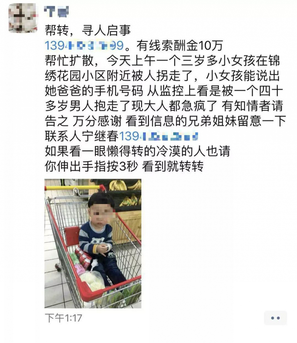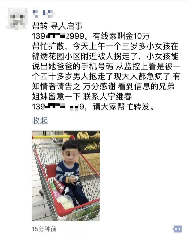 深圳晚報(bào)2019年2月13日訊 2月10日晚間一則內(nèi)容為"家長(zhǎng)懸賞10萬(wàn)元尋找3歲被拐女孩"的消息,刷爆了很多網(wǎng)友的微信朋友圈。"幫忙擴(kuò)散,3歲女孩在錦繡花園小區(qū)被拐走,家長(zhǎng)拿出10萬(wàn)元酬金尋人……"網(wǎng)友紛紛傳遞愛心的同時(shí),也在為女孩的安危捏著一把汗。然而,記者調(diào)查發(fā)現(xiàn)實(shí)際情況卻并非如此......