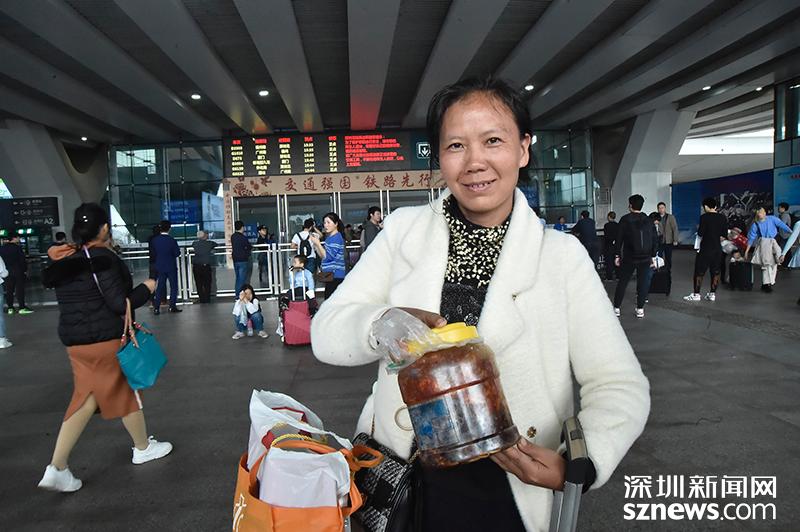不少旅客攜帶當(dāng)?shù)厮约凹亦l(xiāng)特產(chǎn)返回深圳,圖中這一家人下車后整理行李