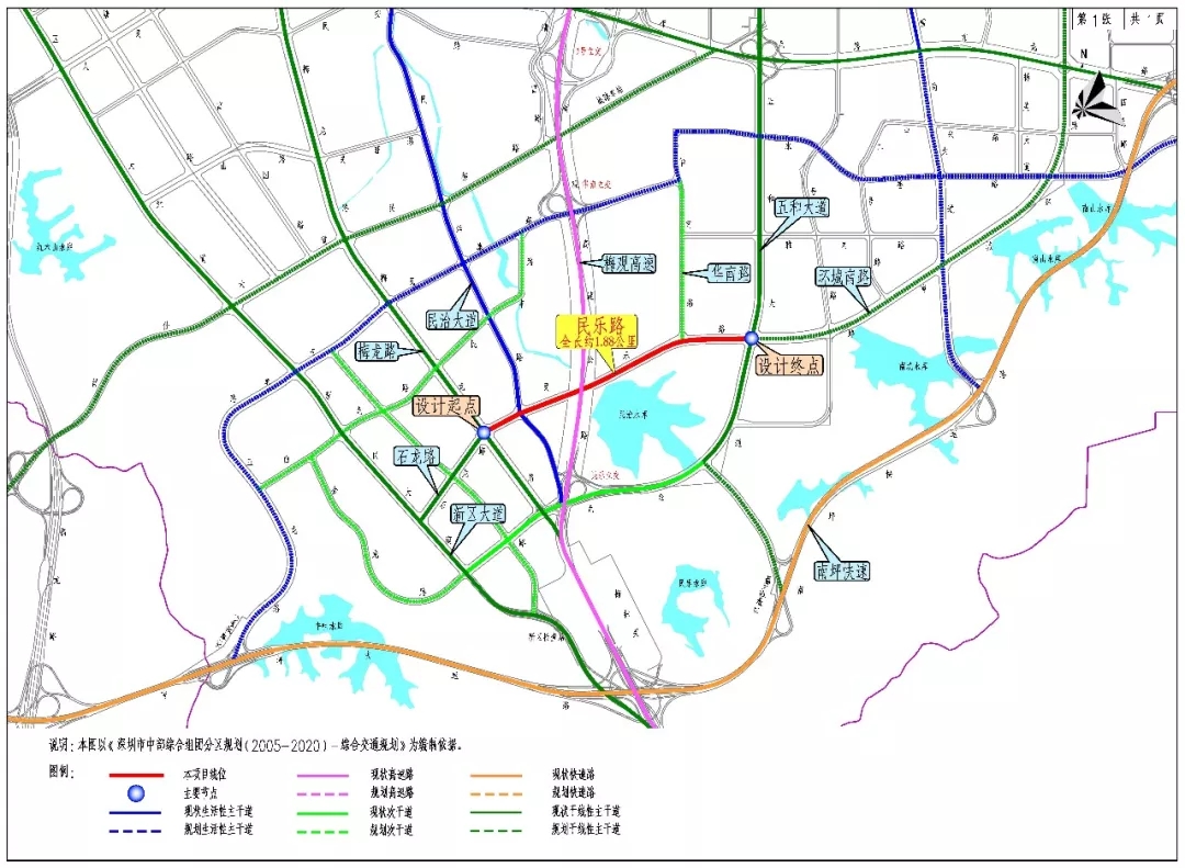 民樂路市政工程,位于深圳市中部綜合組團境內(nèi)的民治街道及坂田街道,道路呈東西走向,西起梅龍路,向東跨梅觀高速后由現(xiàn)狀民治水庫北側(cè)經(jīng)過,終點至五和大道。