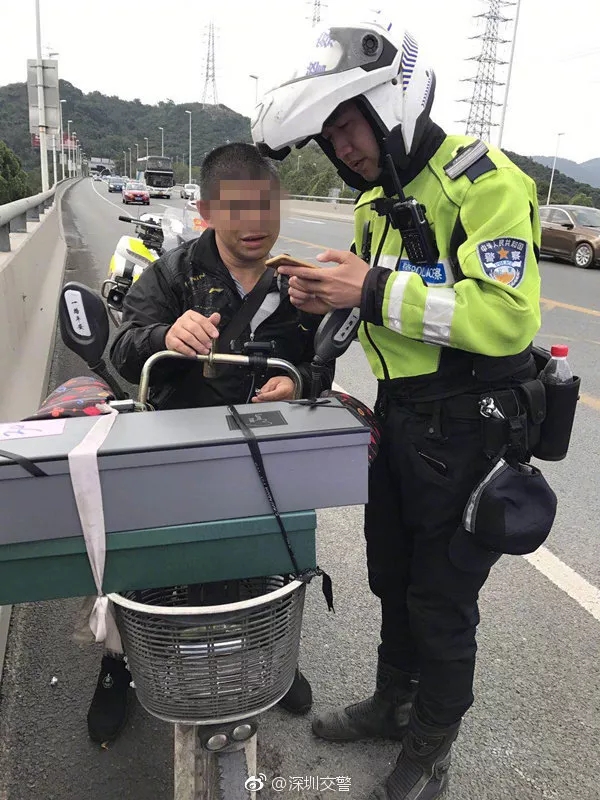 2月14日上午,深圳交警巡邏至南坪快速長嶺陂大橋時發(fā)現(xiàn)一輛非機動車上快速路。上前詢問后得知,男子是幫客戶送禮物的,不料卻迷路了,這才誤闖了快速路。蜀黍?qū)ζ浣逃螅杆賹斒氯俗o送下快速路路口。