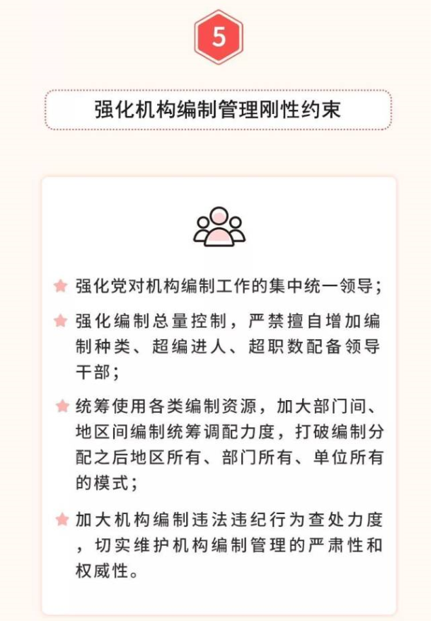 五是全面落實優(yōu)化協(xié)同高效原則。堅持一件事情原則上由一個部門負責,把理順職責放在重要位置,從有利于突出主業(yè)、有利于服務管理的角度出發(fā),實事求是,科學設置黨委和政府機構,宜大則大、宜小則小,該加強的加強、該精簡的精簡、該優(yōu)化的優(yōu)化,實現(xiàn)機構職責的深度融合。