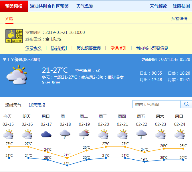 市氣象局預(yù)計,15-16日深圳市可見陽光,溫暖濕潤早晚有(輕)霧,氣溫在20-28℃;17-18日天氣轉(zhuǎn)涼,沿海及高地陣風(fēng)可達(dá)8級;18日有小到中雨;19日小雨轉(zhuǎn)多云。請市民注意關(guān)注低能見度和大風(fēng)對交通和戶外作業(yè)安全的影響。