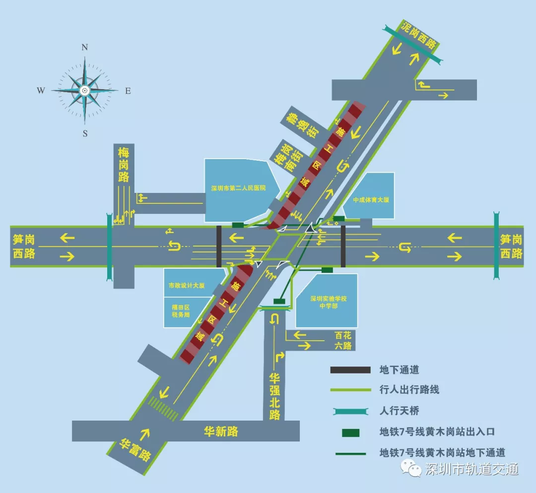 1.黃木崗立交橋拆除后,地面恢復成平交燈控十字路口,筍崗西路、華富路、泥崗西路實現(xiàn)雙向六車道通行,華強北路繼續(xù)中斷。