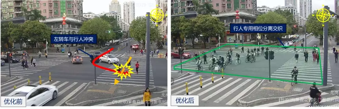 民治街道玉龍學校周邊信號路口致遠/龍匯路口在上學時段啟用機動車控右策略,在開學當天上下學時段通過對機動車采取控右策略,避免右轉流與側邊行人過街的干擾,消除安全隱患。