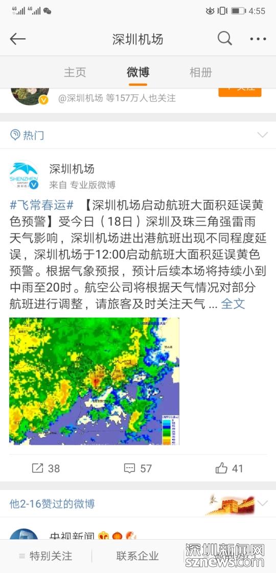 深圳新聞網(wǎng)2月18日訊(記者 涂勝)記者從深圳機場獲悉,受今日(18日)深圳及珠三角強雷雨天氣影響,深圳機場進出港航班出現(xiàn)不同程度延誤,深圳機場于12:00啟動航班大面積延誤黃色預警。