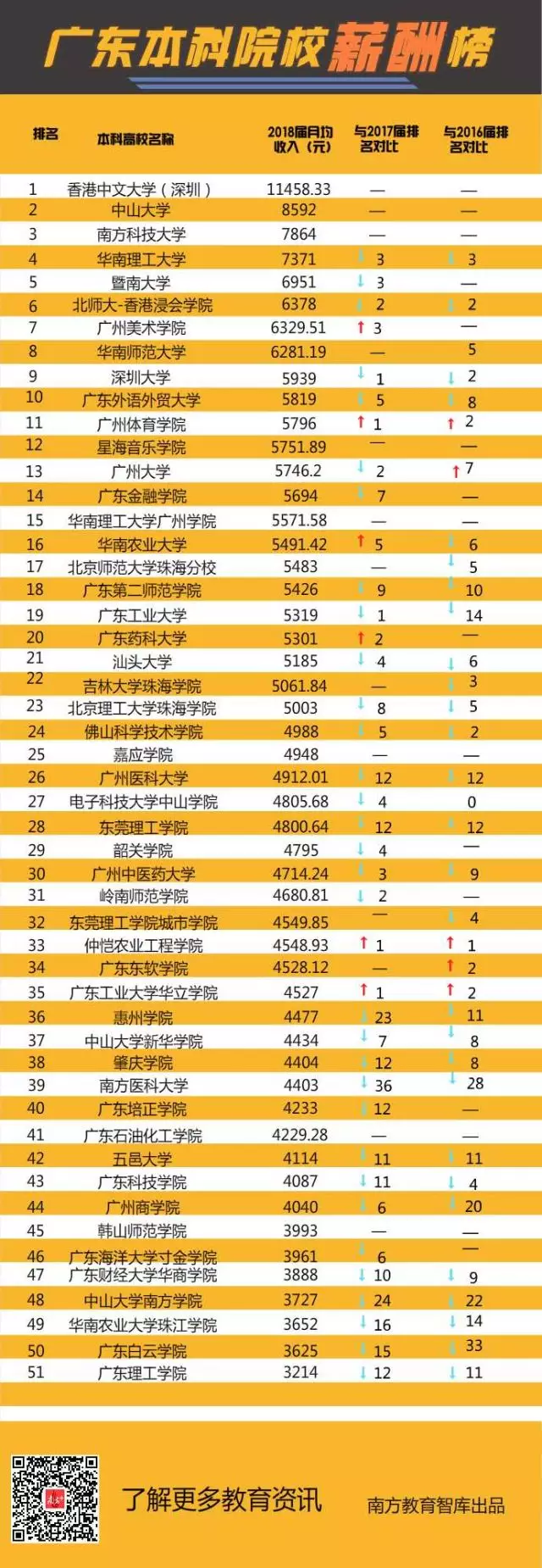 不久前,省教育廳發(fā)布了《2018年高校畢業(yè)生就業(yè)質(zhì)量年度報告》,全省本科畢業(yè)生平均月薪為4522元。已公布相關(guān)數(shù)據(jù)的51所本科高校中,有35所超過了全省本科畢業(yè)生的平均月薪,其中中山大學(xué)8592元、南方科技大學(xué)7864元、華南理工大學(xué)7371元名列前3位,均超過7000元。