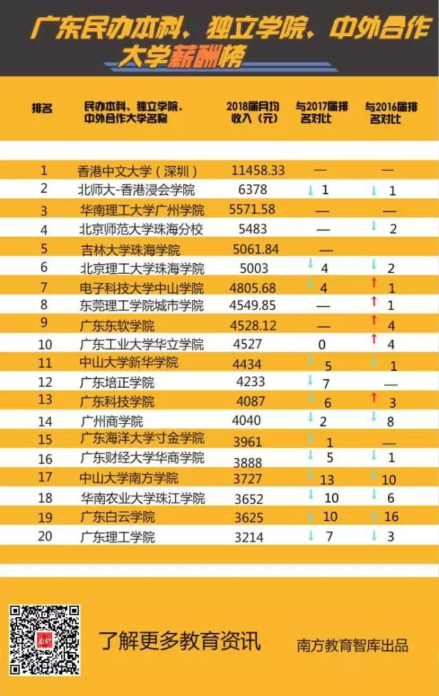 ▲廣東民辦本科、獨立學(xué)院、中外合作大學(xué)薪酬20強(qiáng),港中文(深圳)成全省首個平均月薪過萬高校。