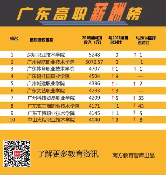 ▲廣東高職薪酬10強(qiáng),深職院、廣州民航平均月薪超5000元,超過不少本科院校。
