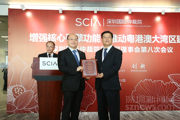 2月21日的發(fā)布會上,深圳市副市長黃敏為新聘任的兩名深圳國際仲裁院理事袁國強(香港前律政司司長)、劉春華(中聯(lián)辦法律部部長)頒發(fā)了聘書。