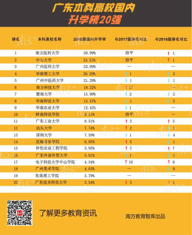 在發(fā)布“薪酬榜”后(點擊查看“薪酬榜”),今天南方教育智庫繼續(xù)獨家推出廣東高?!吧龑W榜”,梳理全省123所高校發(fā)布的《2018年畢業(yè)生就業(yè)質(zhì)量年度報告》的關鍵數(shù)據(jù),聚焦畢業(yè)生的深造路徑和升學比例。其中南方醫(yī)科大學、中山大學、廣州醫(yī)科大學本科畢業(yè)生國內(nèi)升學率位列前3名,均超過33%。