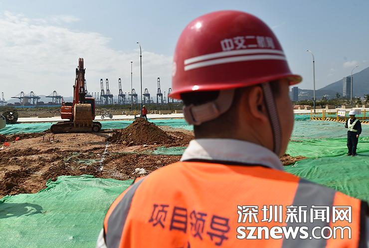 位于鹽田區(qū)的鹽港東立交工程現(xiàn)場施工團(tuán)隊人員在現(xiàn)場進(jìn)行督導(dǎo)