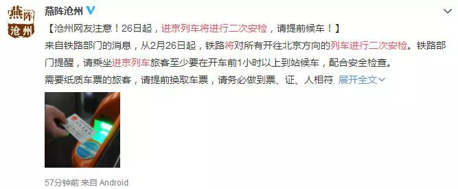 從2月26日起,鐵路將對所有開往北京方向的列車進行二次安檢,即旅客在車站各進站口安檢后還需要前往固定區(qū)域再進行一次安檢。