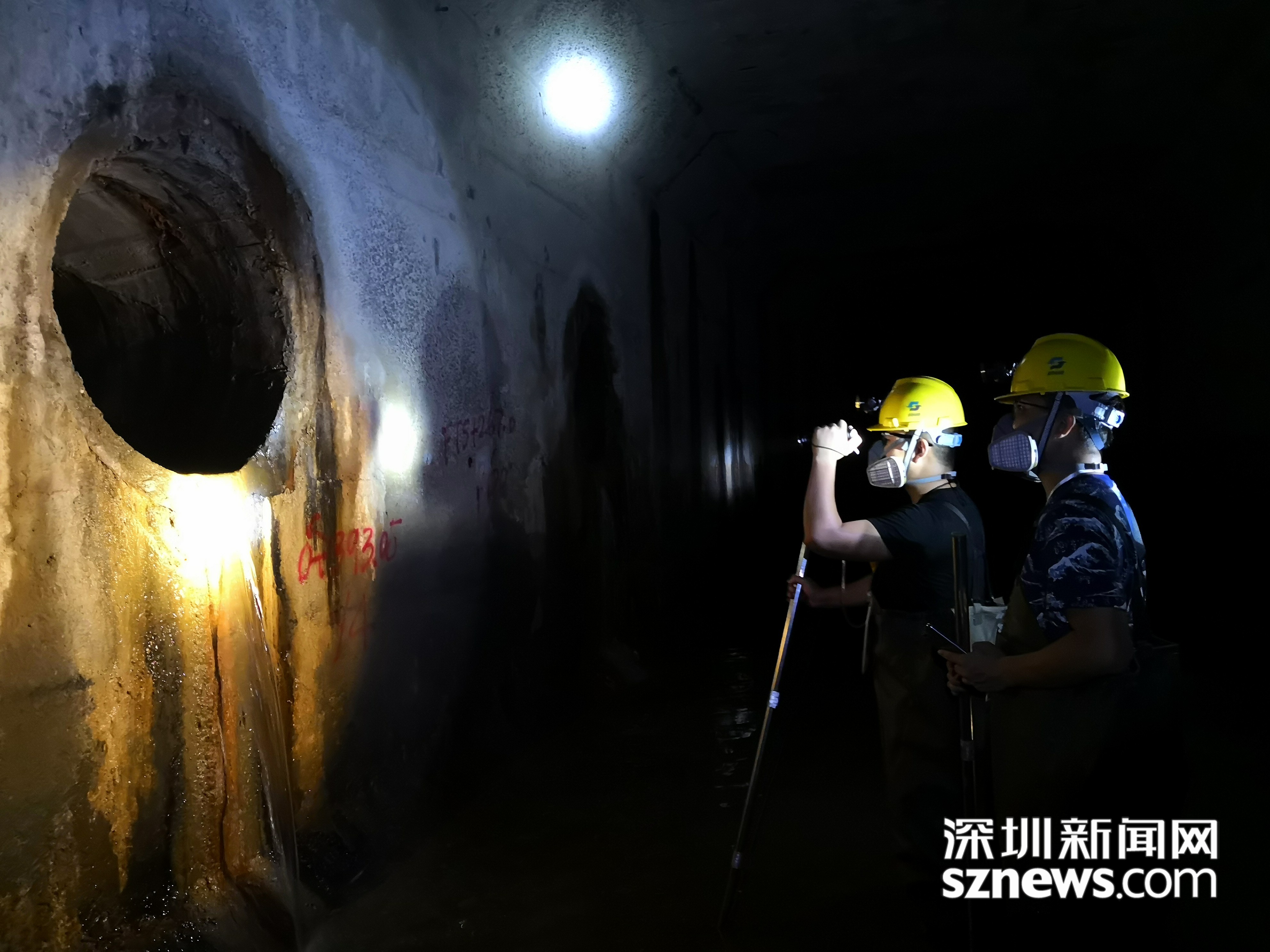 王經(jīng)波(左一)正檢查暗渠內(nèi)排水口是否有污水排出