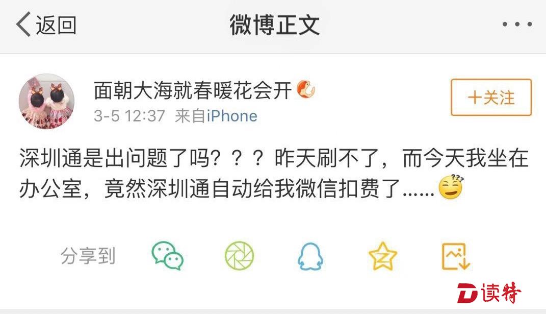 據(jù)微博網(wǎng)友“@面朝大海就春暖花會開”反映,3月5日中午,自己坐在辦公室還被“深圳通+”小程序微信扣費(fèi)。市民何先生也致電本報(bào)說,“中午12點(diǎn)30分左右,自己坐312公交車,用微信深圳通小程序刷卡,被重復(fù)扣費(fèi)一次,聯(lián)系深圳通公司無人接聽。”